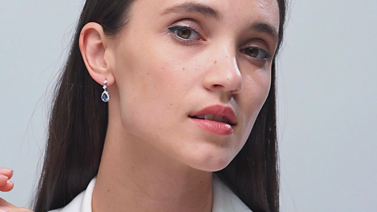 Pear Blue Sapphire Drop Earrings with Diamond Halo